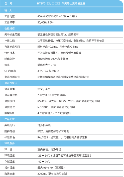 華天HTSVG靜止無功發生器是山大華天自主研發的有源動態無功補償裝置。該裝置可對無功功率、諧波以及三相不平衡進行實時跟蹤補償,從而為電網或用電負荷提供快速動態無功補償和諧波濾除,可有效提高電網電壓暫態穩定性、抑制母線電壓閃變、補償不平衡負荷、濾除諧波及提高功率因數。
