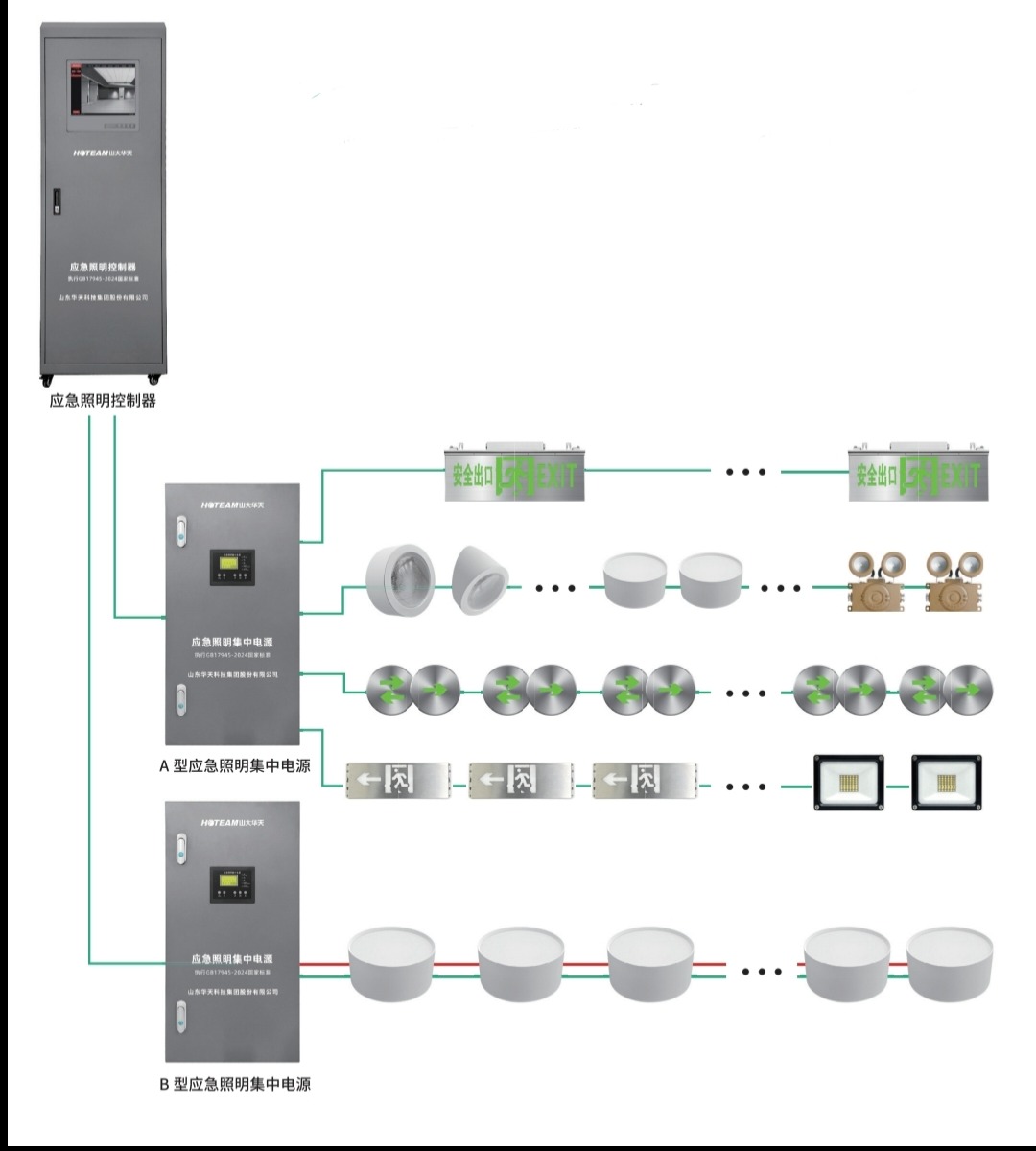 集中電源集中控制型系統由應急照明控制燈、應急照明集中電源、集中電源集中控制型消防應急燈具及相關附件組成。