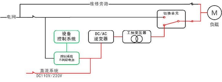 該系統(tǒng)在正常情況下由電網(wǎng)電源供電,經(jīng)由切換單元為后端負載提供交流電源,同時設(shè)備輔助電源也取自電網(wǎng)電源。直流系統(tǒng)電源(DC110V/220V)通過斷路器分別接入逆變器與設(shè)備輔助電源,此時逆變器處于熱備用狀態(tài)。當(dāng)電網(wǎng)發(fā)生斷電時,逆變器立即切換為運行模式,將直流電轉(zhuǎn)換為交流電,為后續(xù)負載提供不間斷的電力供應(yīng)。