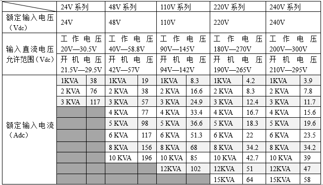 表二:直流系列輸入電壓范圍及額定直流電流 (電壓誤差:+/-0.5~2V)