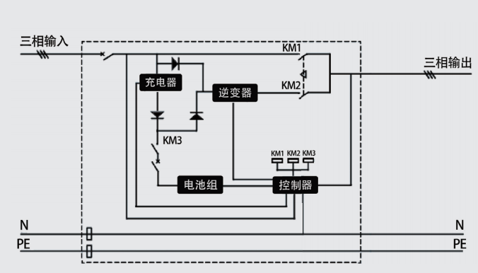 說明:設備內部由逆變器、充電器、電池組、控制器、切換器件KM1、KM2、KM3等構成。