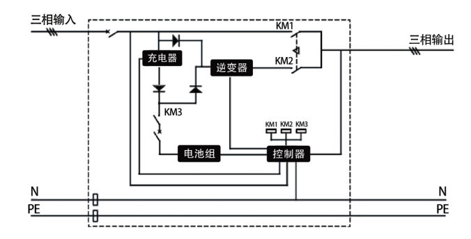 說明:設(shè)備內(nèi)部由逆變器、充電器、電池組、控制器、接觸器KM1、KM2、KM3等構(gòu)成。設(shè)備處于“自動”運行狀態(tài)時,如果市電輸入正常,KM1、KM3吸合,輸出市電;同時,市電經(jīng)充電器對蓄電池充電,此時逆變器不工作。當(dāng)市電中斷或異常時,控制器啟動逆變器,同時控制KM1斷開、KM2吸合,電池組的直流電經(jīng)過逆變器轉(zhuǎn)換為交流電供給應(yīng)急輸出負(fù)載。其他運行模式僅為控制方式上的區(qū)別,工作原理基本相同。